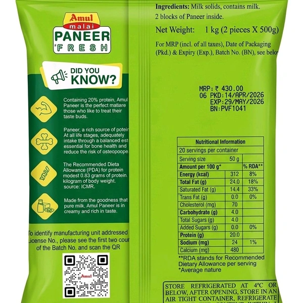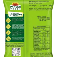 Amul Malai Paneer is a rich source of protein and calcium, made from pure milk for a creamy and rich taste. This pack contains two 500g vacuum-sealed blocks for lasting freshness. Ideal for making delicious paneer butter masala, matar paneer, or grilled snacks. Store refrigerated at 4^{\circ}\text{C} or below.